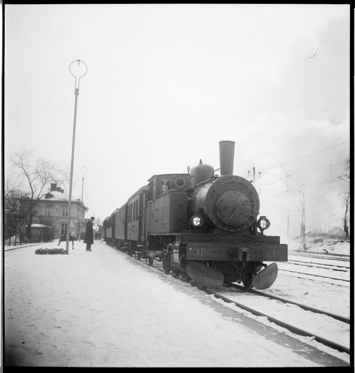Ånglok med personvagnar vid Köping station. Köping - Uttersbergs Järnväg, KUJ lok 11.