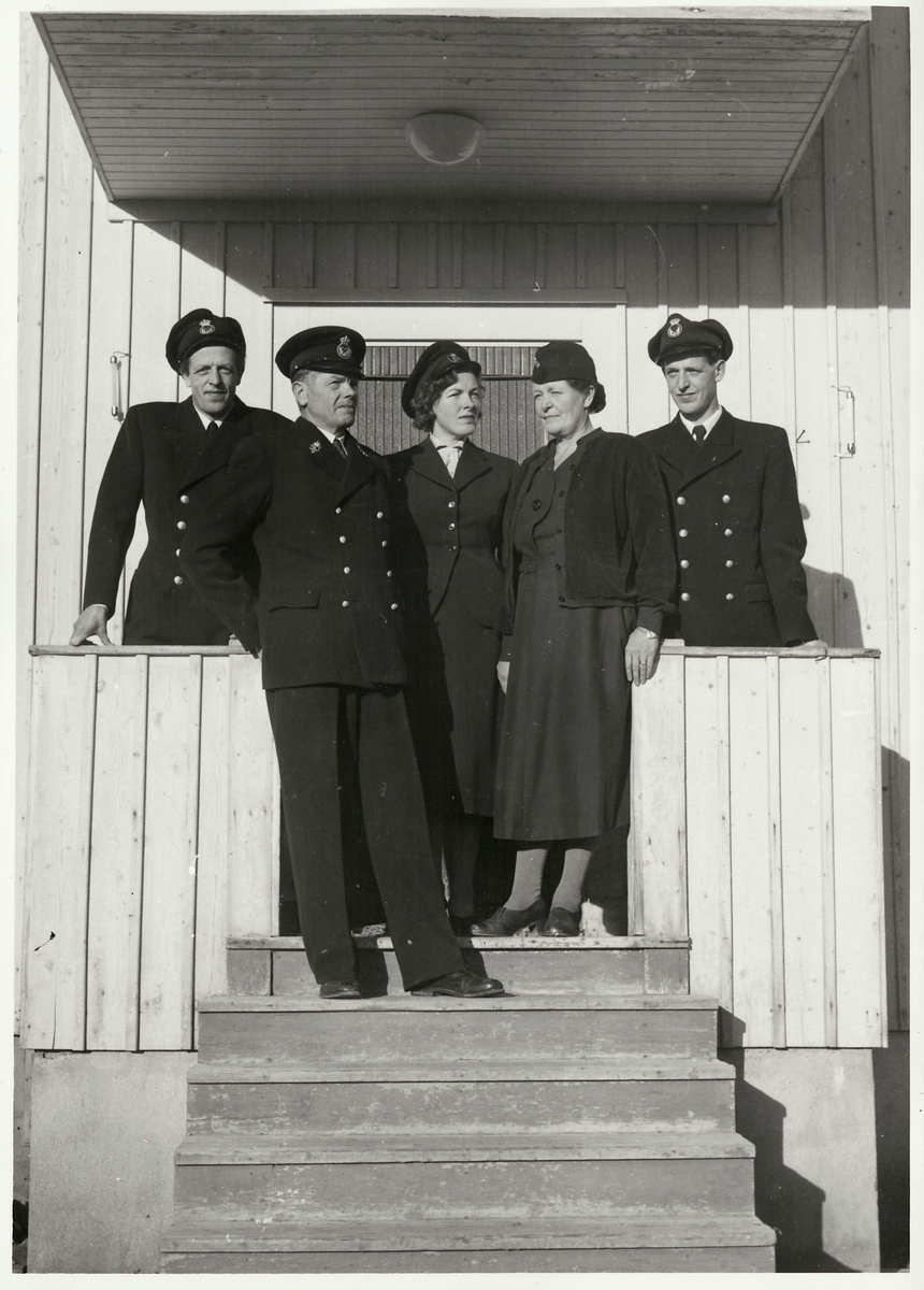 Trafikbiträde John Johansson, Gnarp, Banbiträde Jöns Johansson,Fåker, fru Märta Ahlgren, Fåker, fru Linna Johansson, Gnarp, stationskarl Ragnvald Johansson, Åsarna på trappan till föräldrahemmet i Fåker.
