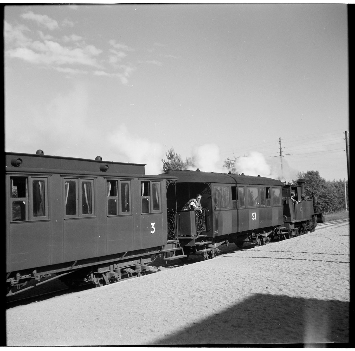 Persontåg med bland annat Statens Järnvägar, SJ personvagn 295 draget av ånglok.