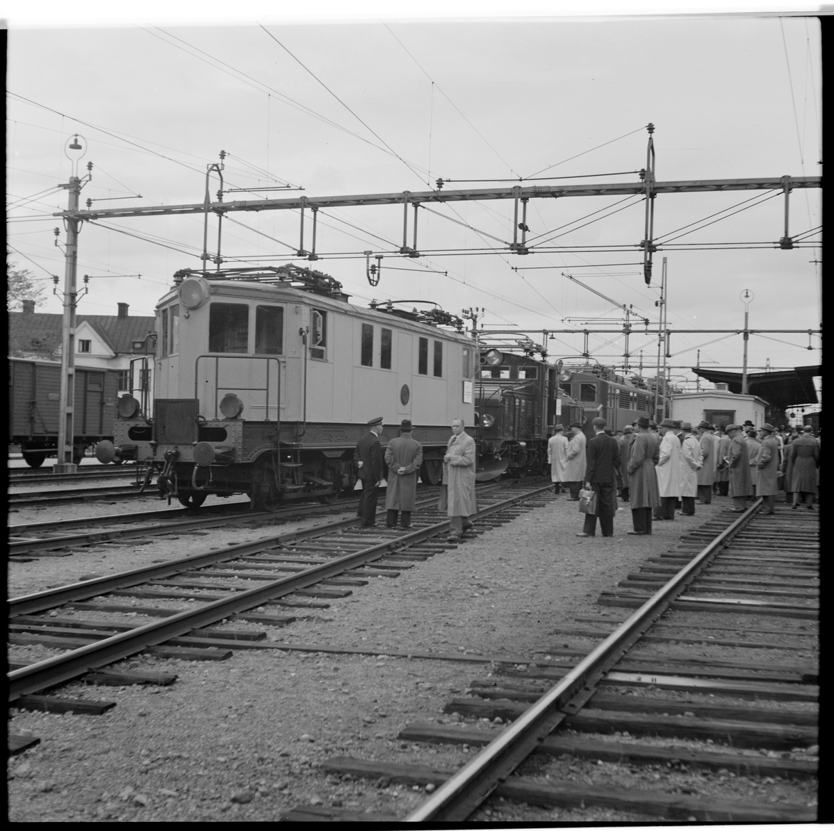 Fordon, resande och personal på bangården.