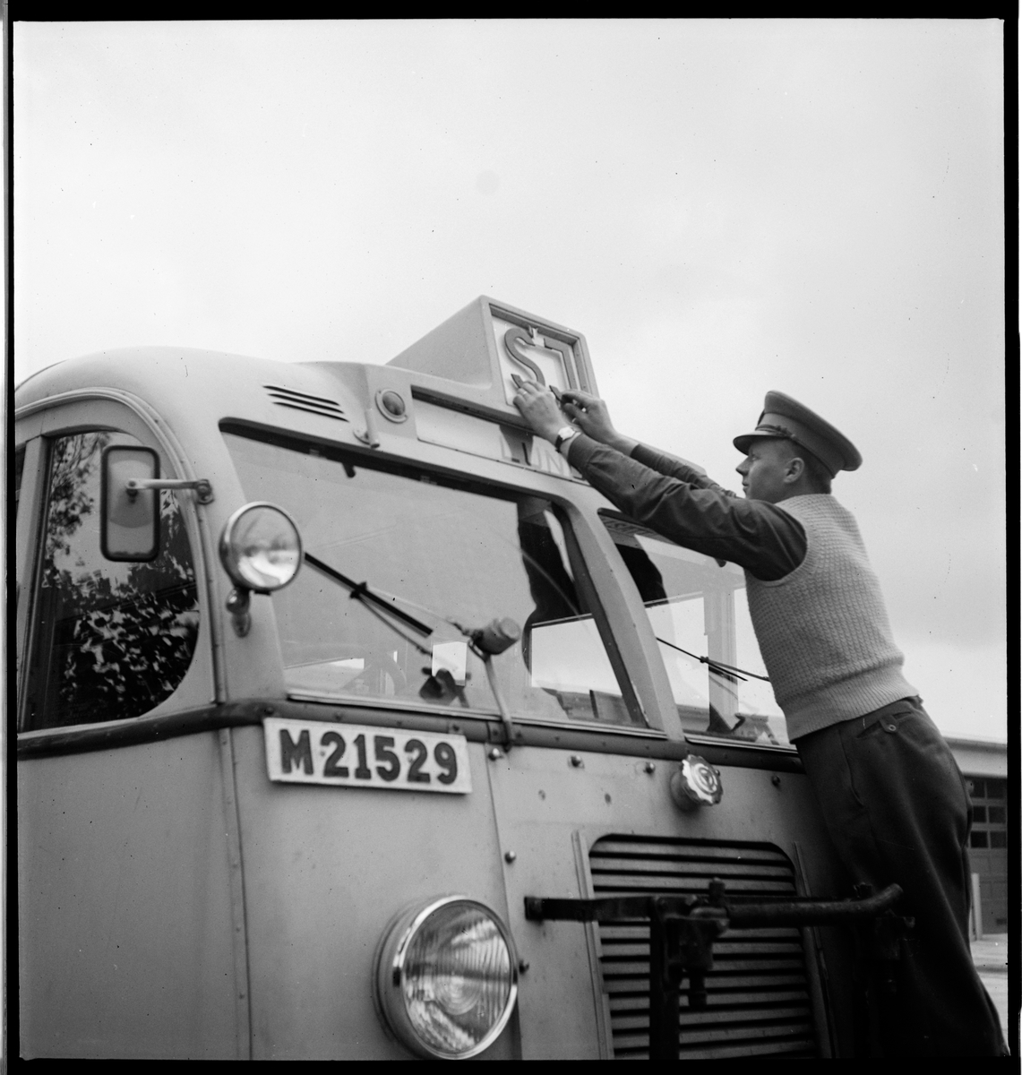 Montering av Statens Järnvägar, SJ:s emblem på en buss.