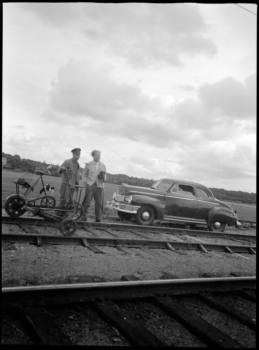 En SJ-anställd och en man med kamera står och samtalar. Brevid står en Nash Ambassador slipstream.