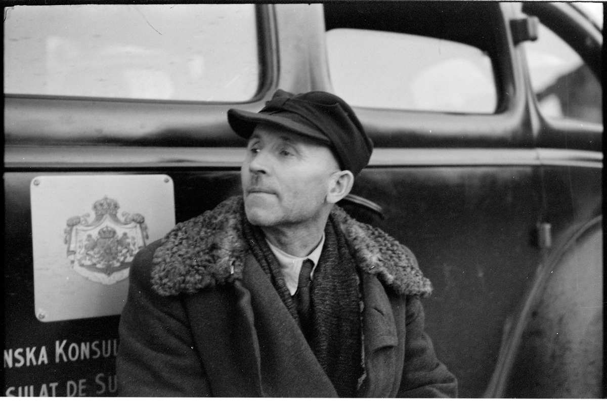 Man vid en bil från Svenska Konsulatet, Gdansk 1945.