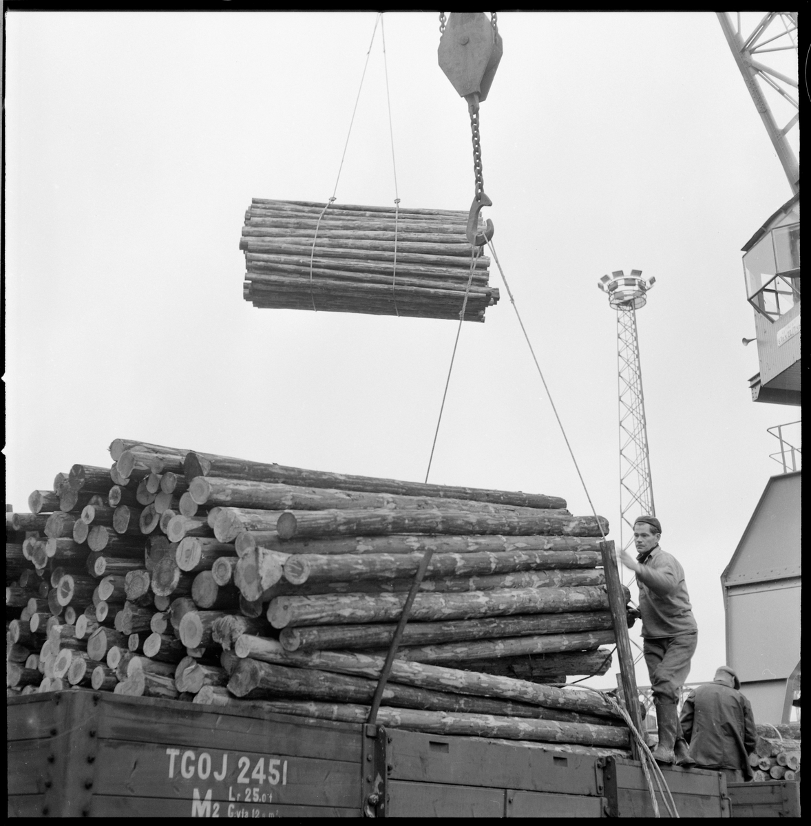 Lastning av timmer. Trafikaktiebolaget Grängesberg–Oxelösunds Järnvägar, TGOJ M2 2451.