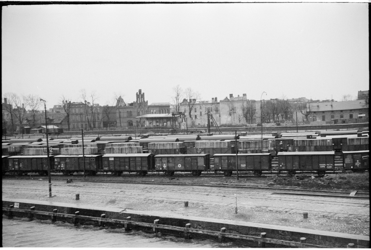Godsbangård. I bakgrunden syns en sönderbombad kuststad.