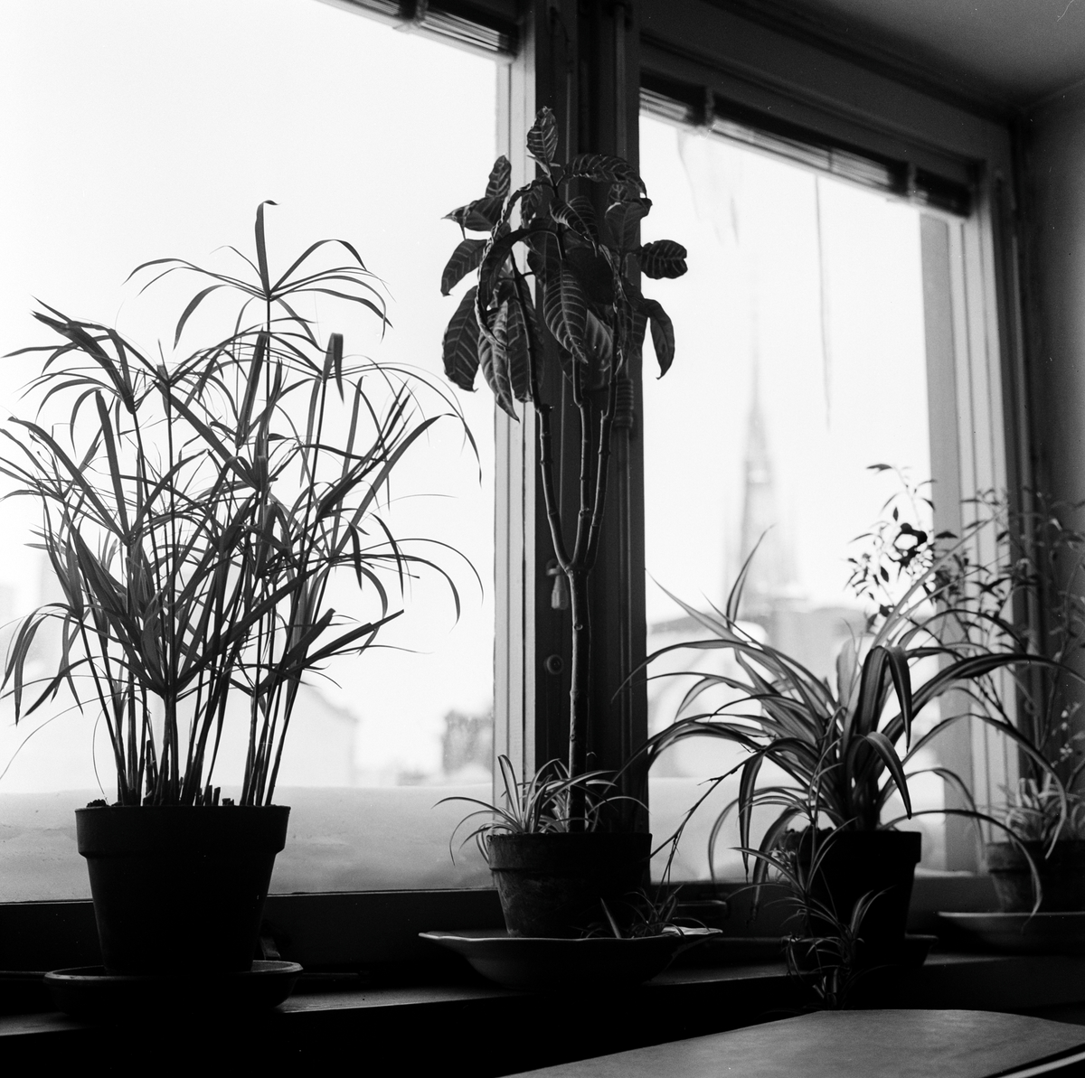 Jourgruppen, vintern -63. Blomkrukor med blommor. St: Clara kyrka utanför fönstret.