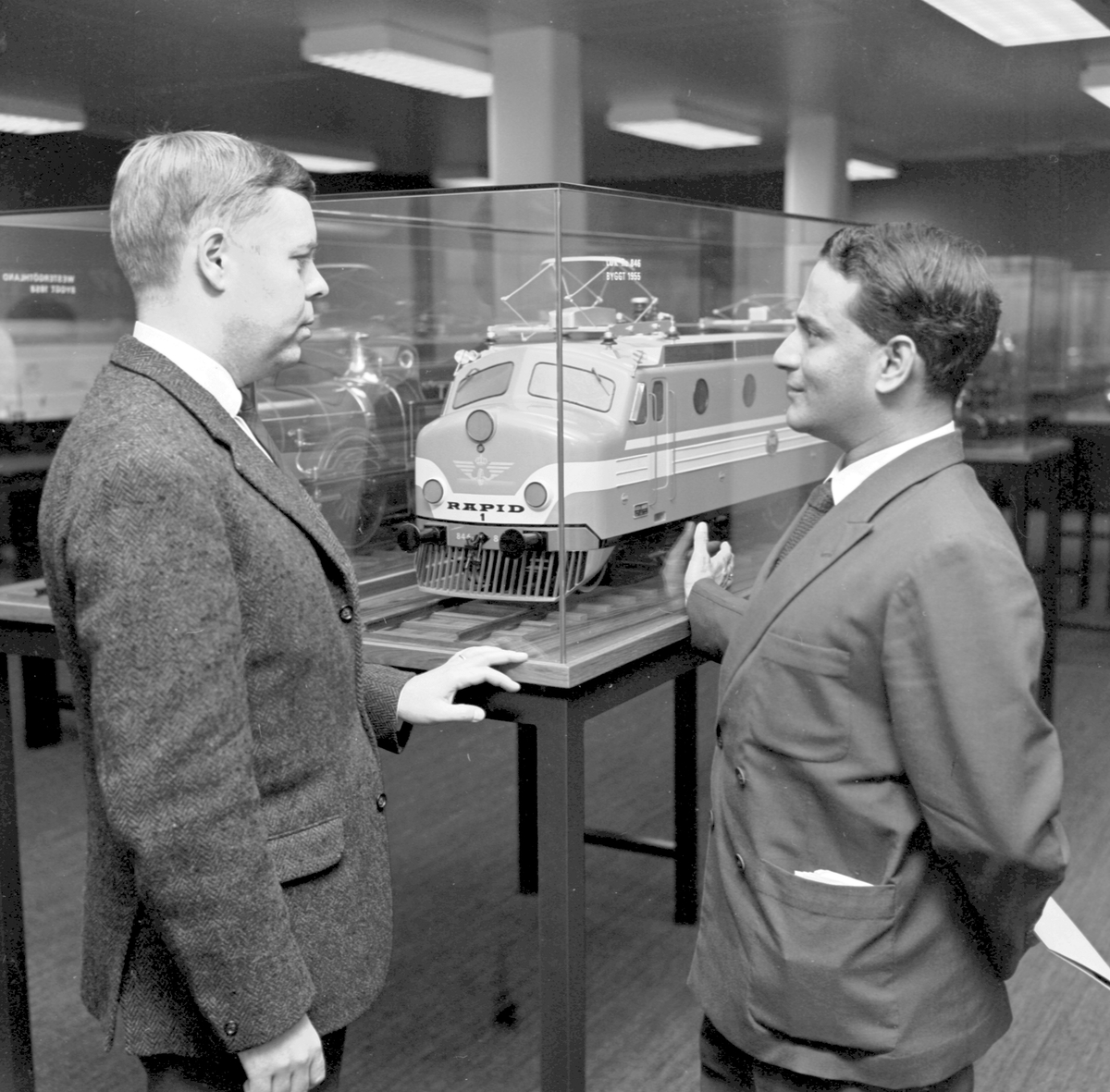Indisk chefredaktör och Alrenius besöker Järnvägsmuséets, Jvm, modellhall på Stockholms Centralstation. Modell "Rapid 1"