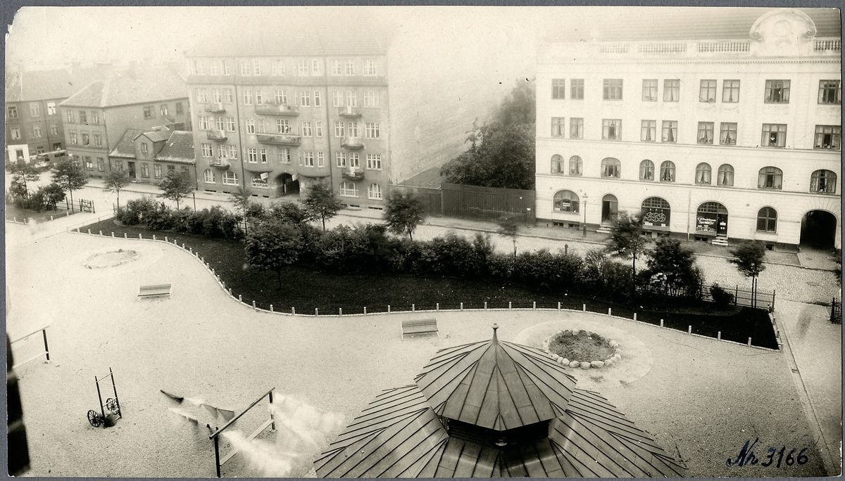 Gårdsplanen utanför änke- och pupillkassans boställshus i Malmö. Kvarteret Håkan Slussgatan 2. Husen mitt emot kvarteret Kasper.
