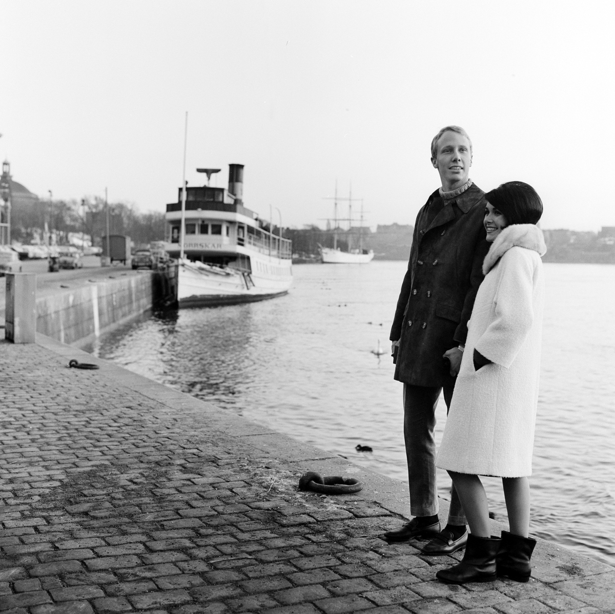 Amerikanska ungdommar, fotogaraferade på Strömkajen. Skärgårdsfärja och den tremastade fullriggaren af Chapman i bakgrunden.