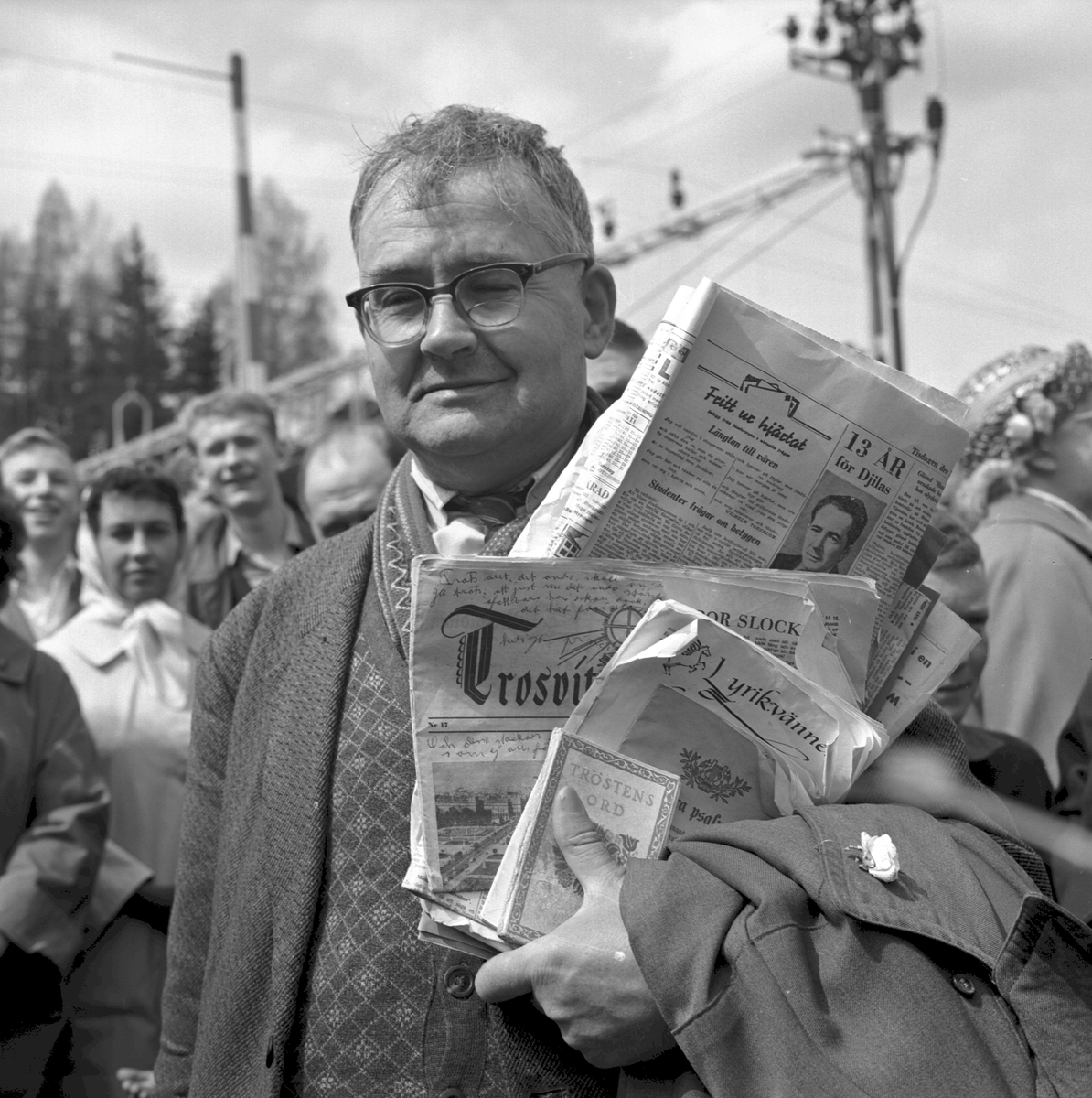 Elektrifiering av sträckan Borås-Alvesta. Man med dagstidning och religiösa tidskrifter