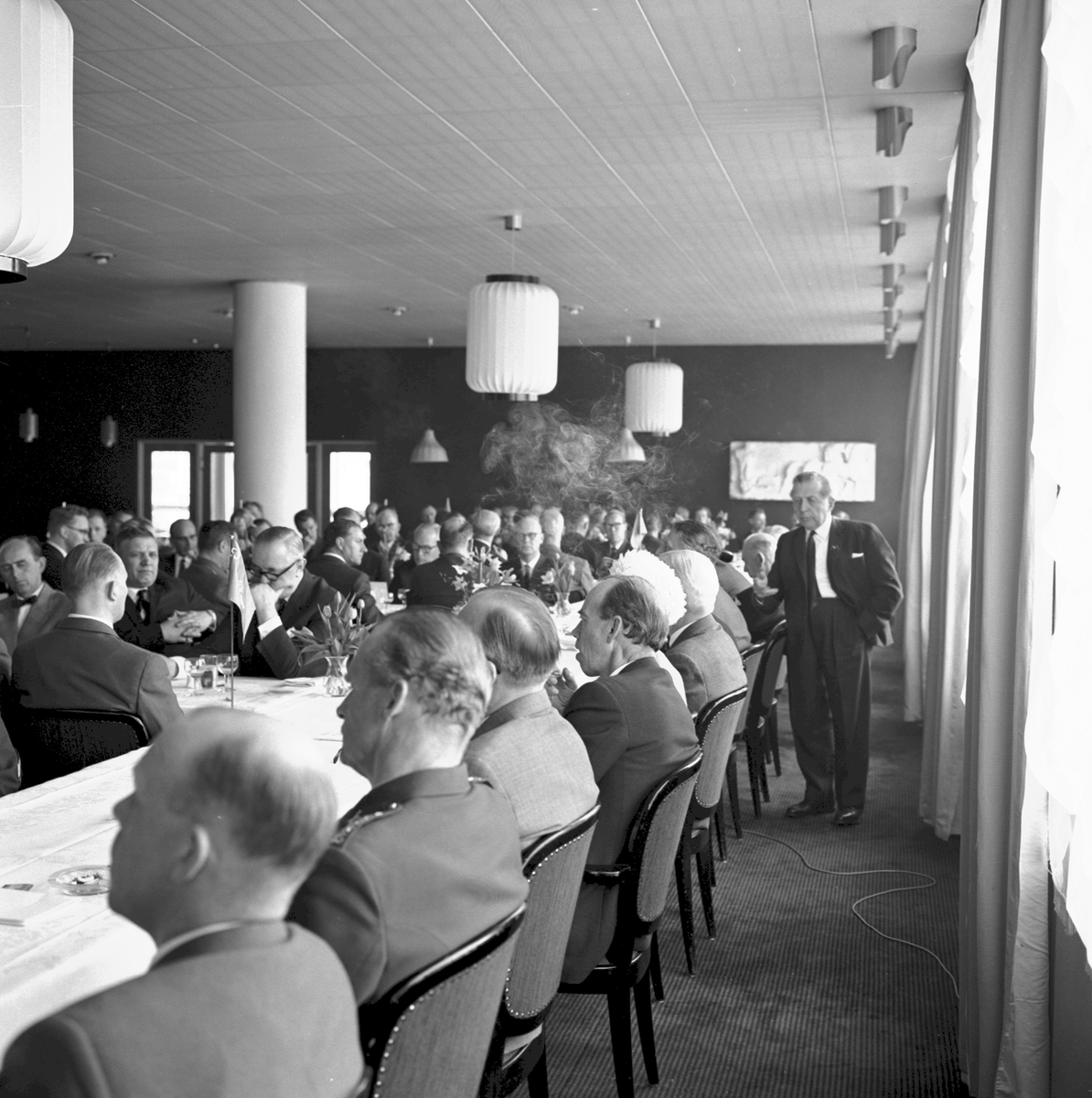 Elektrifiering av sträckan Borås-Alvesta. Generaldirektör, Gd, Erik Upmark, 7:a från vänster sittandes vid bordet. Kommunikationsminister, Gösta Skoglund, ståendes till höger