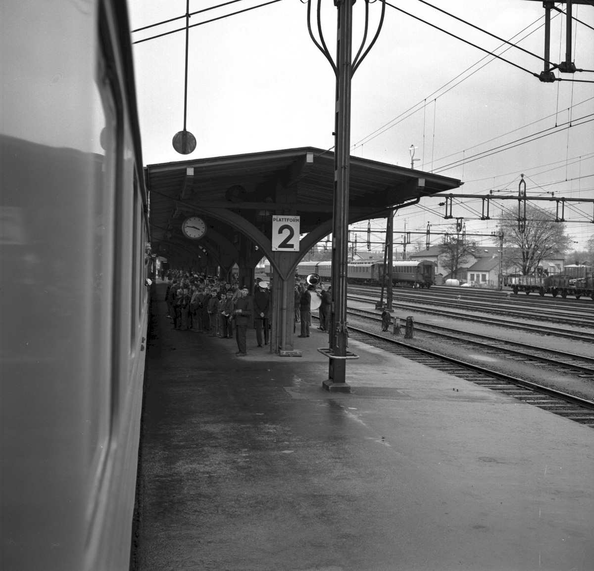 Elektrifiering av sträckan Borås-Alvesta. Första eltåget, SJ Rb2 1003. Plattform 2. Blåsorkester