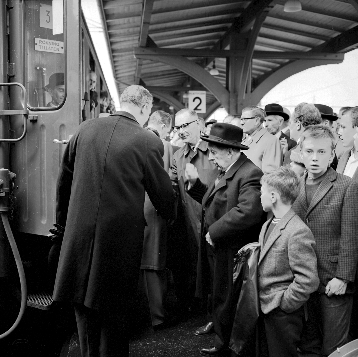 Elektrifiering av sträckan Borås-Alvesta. Första eltåget, SJ Rb2 1003. Generaldirektör, Gd, Erik Upmark, 1:a från vänster med ryggen mot kameran. Kommunikationsminister, Gösta Skoglund, 2:a från väsnter med hatt