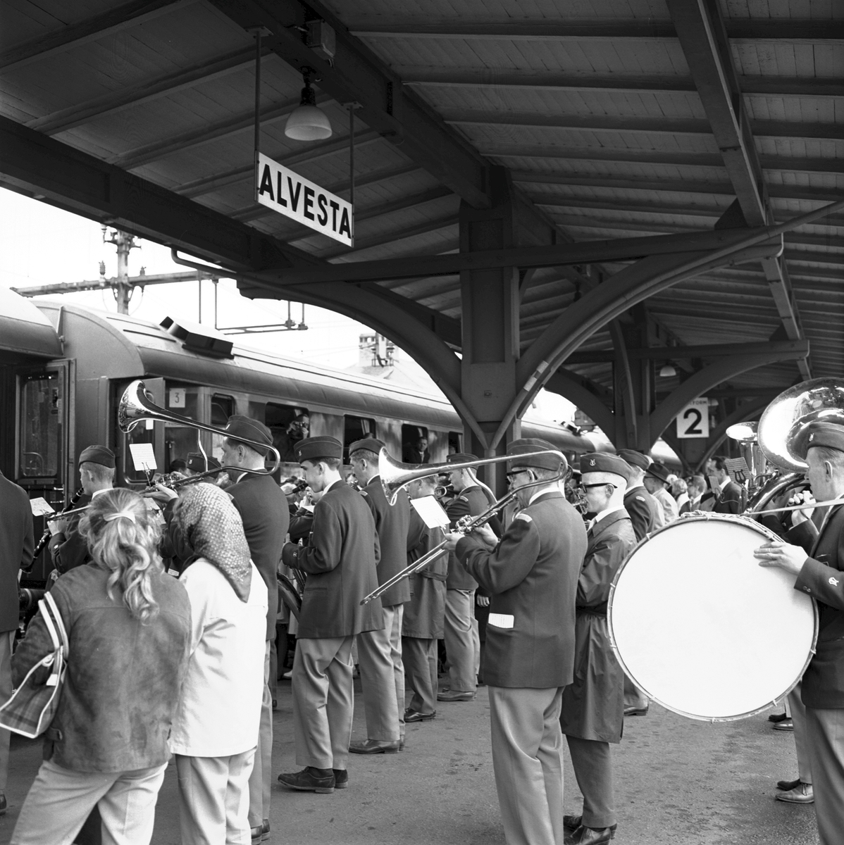 Elektrifiering av sträckan Borås-Alvesta. Första eltåget, SJ Rb2 1003. Blåsorkester