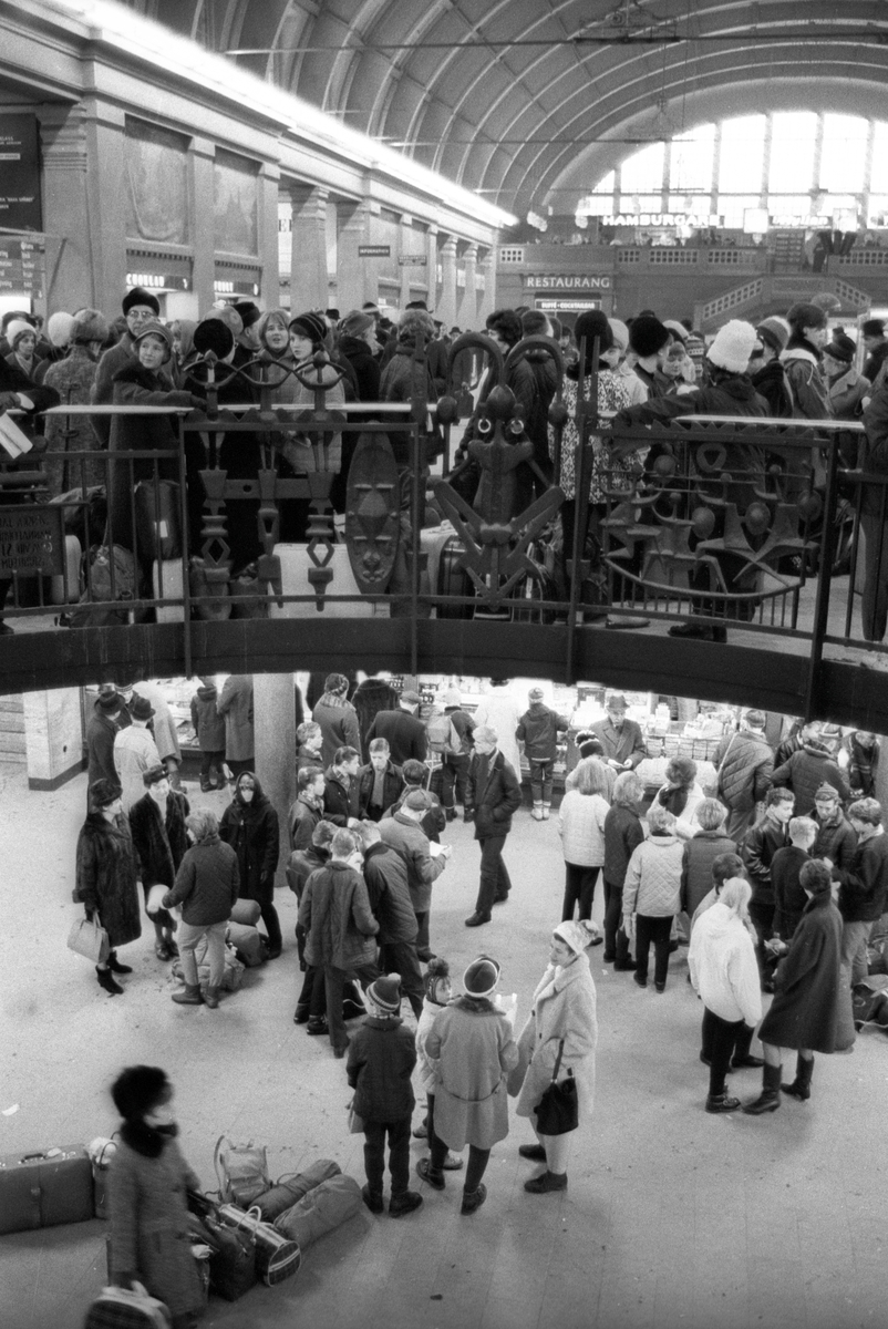 Stockholm Central. Skolresor till fjällen. Bilden tagen vid kanten av staketomgärdade öppningen "Spottkoppen" mellan Stockholm Centrals vänsal och underjodiska passagen till bla, spår och tunnelnana. Fotot taget mot söder.