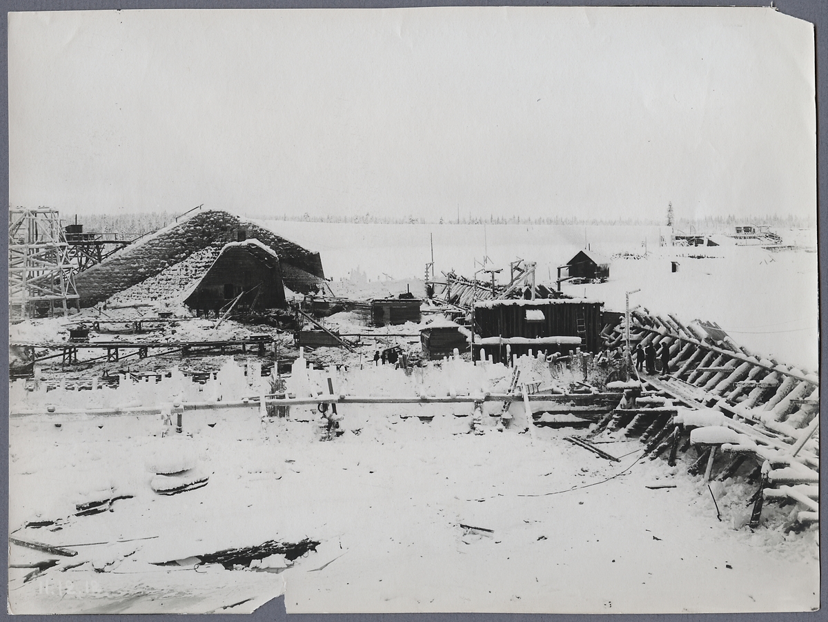 Porjus kraftverk under byggnation vid Stora Lule älv. Arbetslag i arbete bakom fångdammen i den stora fåran.