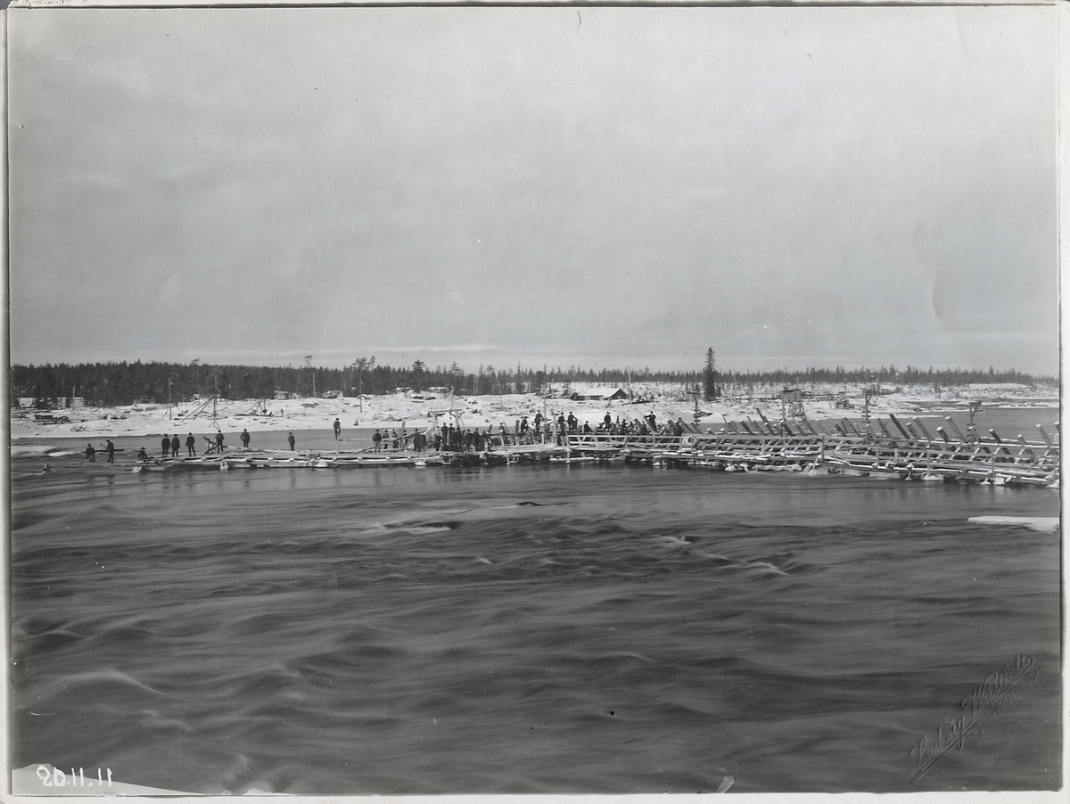 Porjus kraftverk under byggnation vid Stora Lule älv. Stora fångdammsbygget.