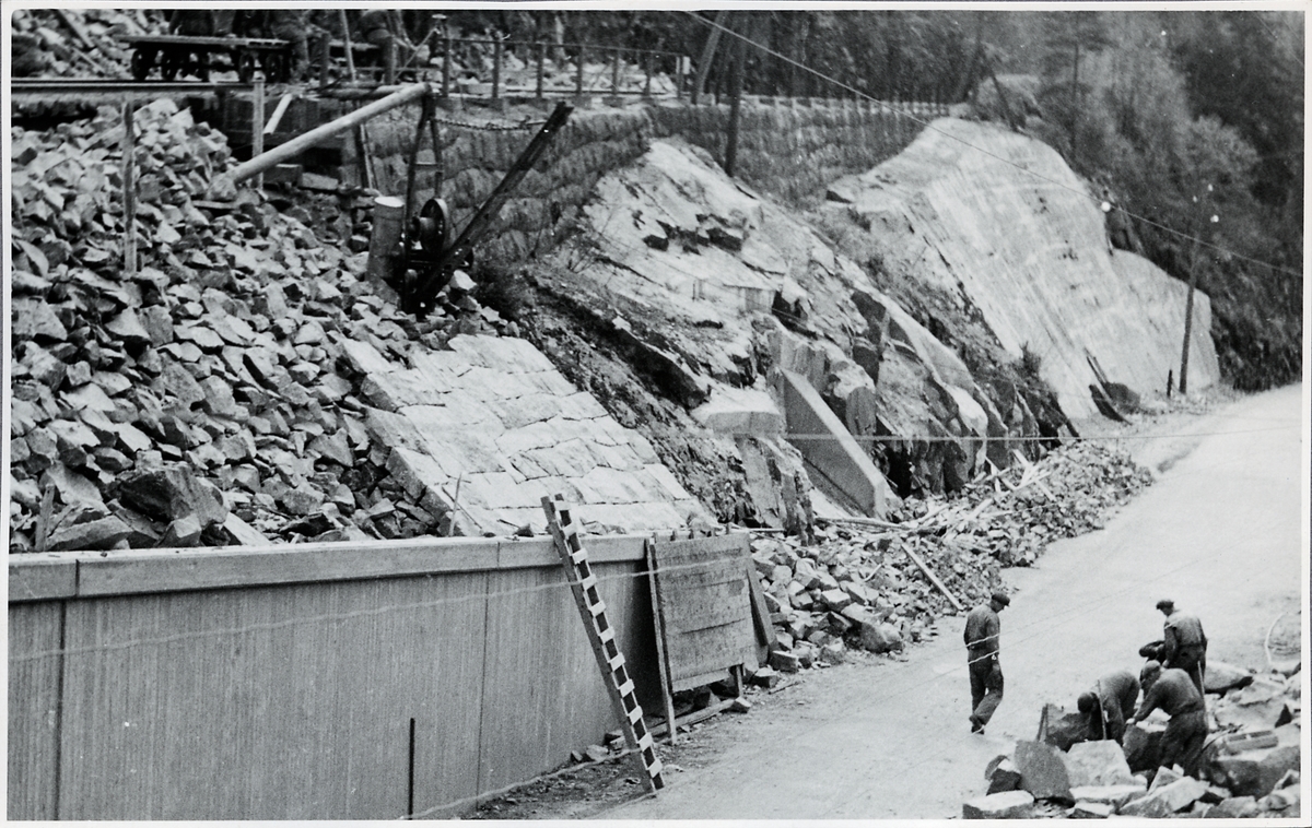 Brobygge vid Viskafors, läggning av stenglacis. På linjen mellan Varberg - Borås.