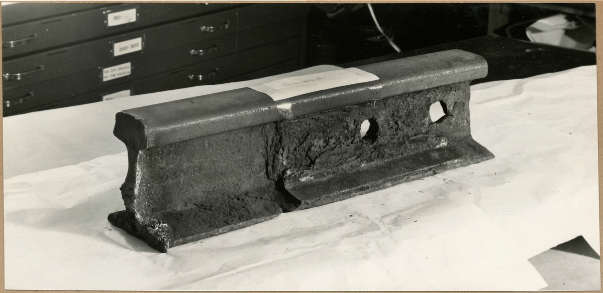 Titel: 1873 års räl med fastrostat skarvjärn. Västerås spår 7. Utbytt 1957.