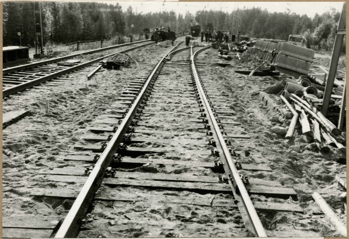 Titel: Rälsutbyte med 1924 års räler och Hey-Backbefästning, spår 2 Loster hösten 1957.
