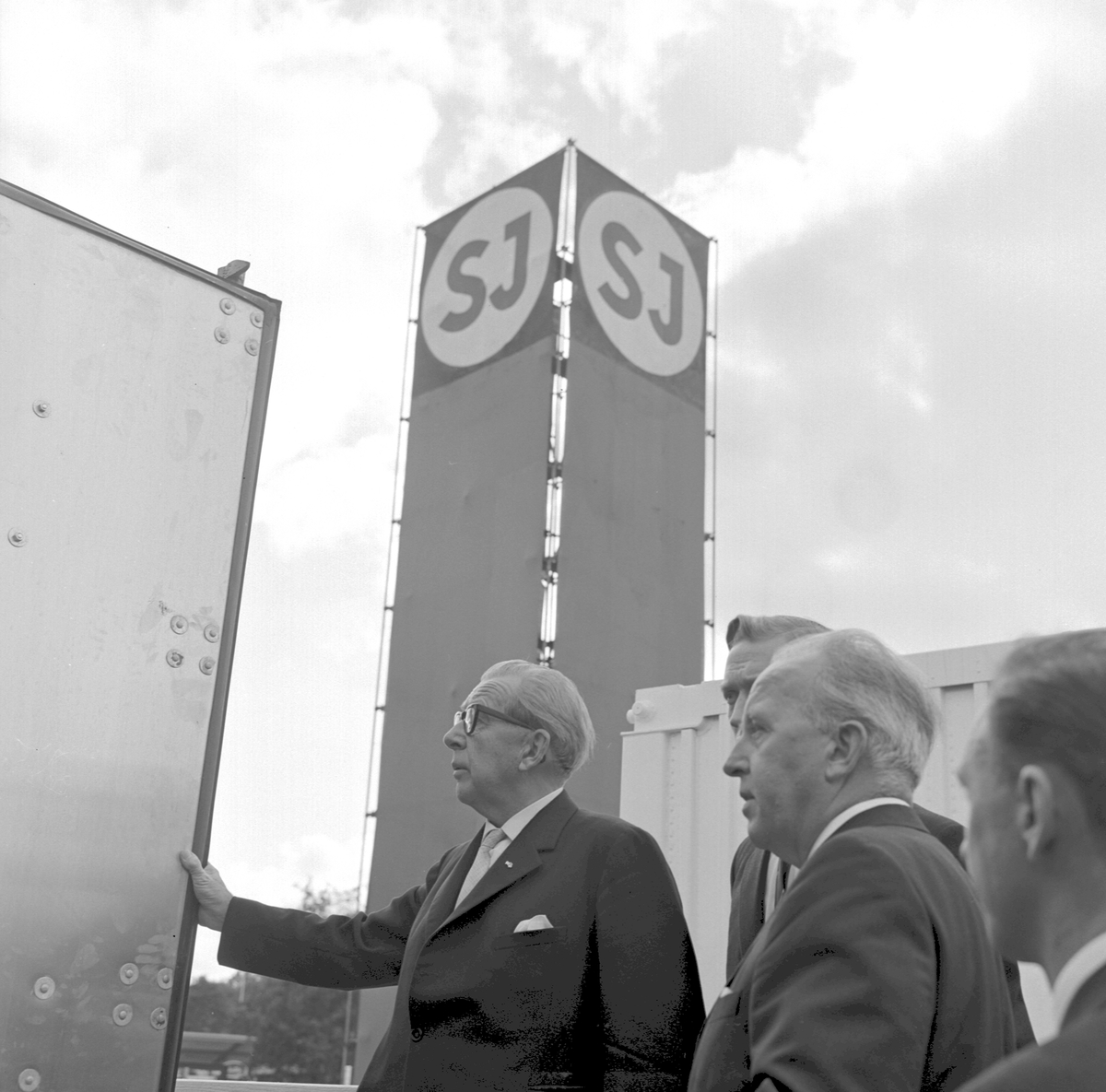 Tredje internationella Trafikmässan i Stockholm. Stadssekreterare i Kommunikationsdepartementet, Lars Petersson, 2:a från vänster. Kommunikationsminister, Gösta Skoglund, 1:a från vänster