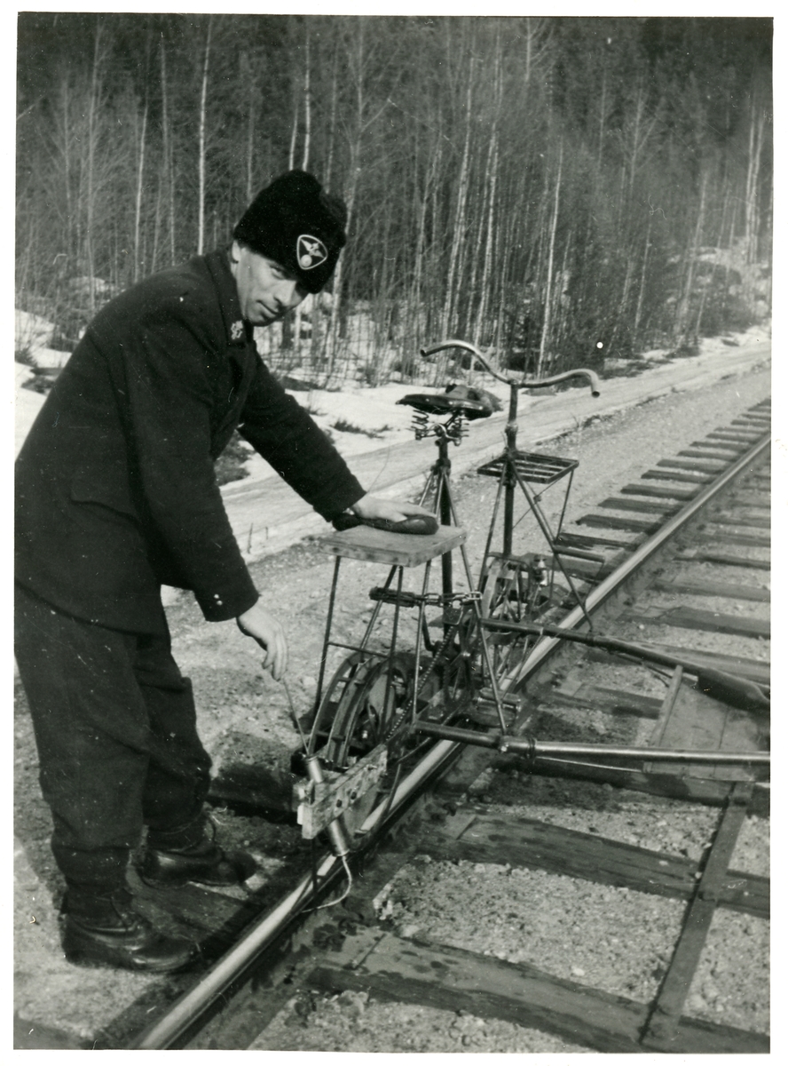 Banvakt Pettersson demonstrerar egentillverkad rälssmörjningsapparat efter linjen mellan Selsjön - Aspeå.