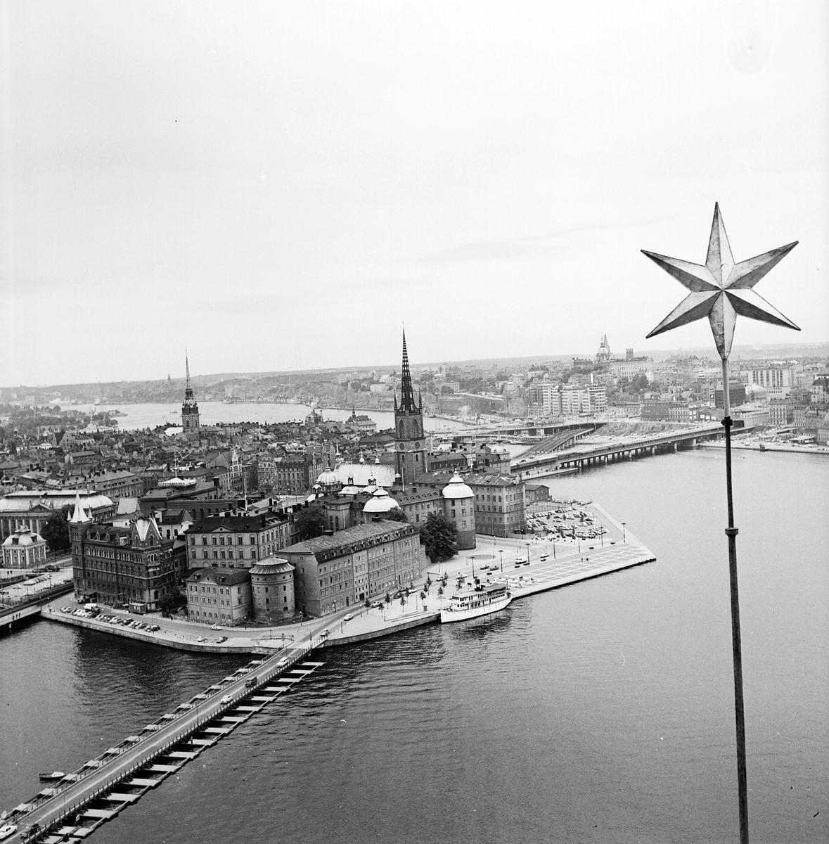 Riddarholmen sedd från Stadshusets torn. Provisoriska pontonbron "Riddarbron" (1954-1967) syns i bildens nedre vänstra hörn. Till höger i bild syns Södra Järnvägsbron mellan Riddarholmen och Mälarstran (Söder Mälarstrand), där bortanför skymtar Mälarrampen och Skeppsbron.