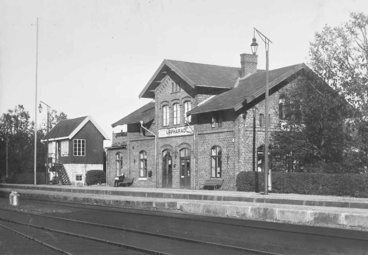 Rött tegel, vit fog. Vita skyltar svart stil.