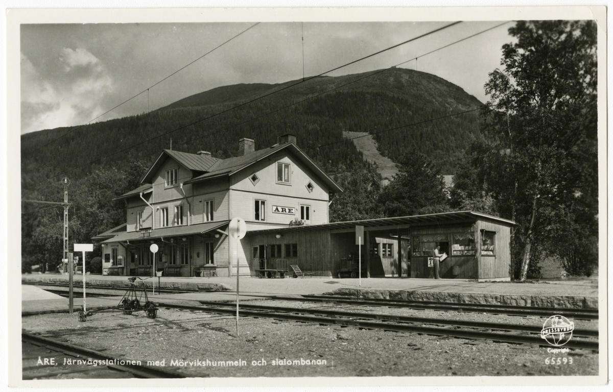 Järnvägsstationen med slalombanan i bakgrunden i Åre.