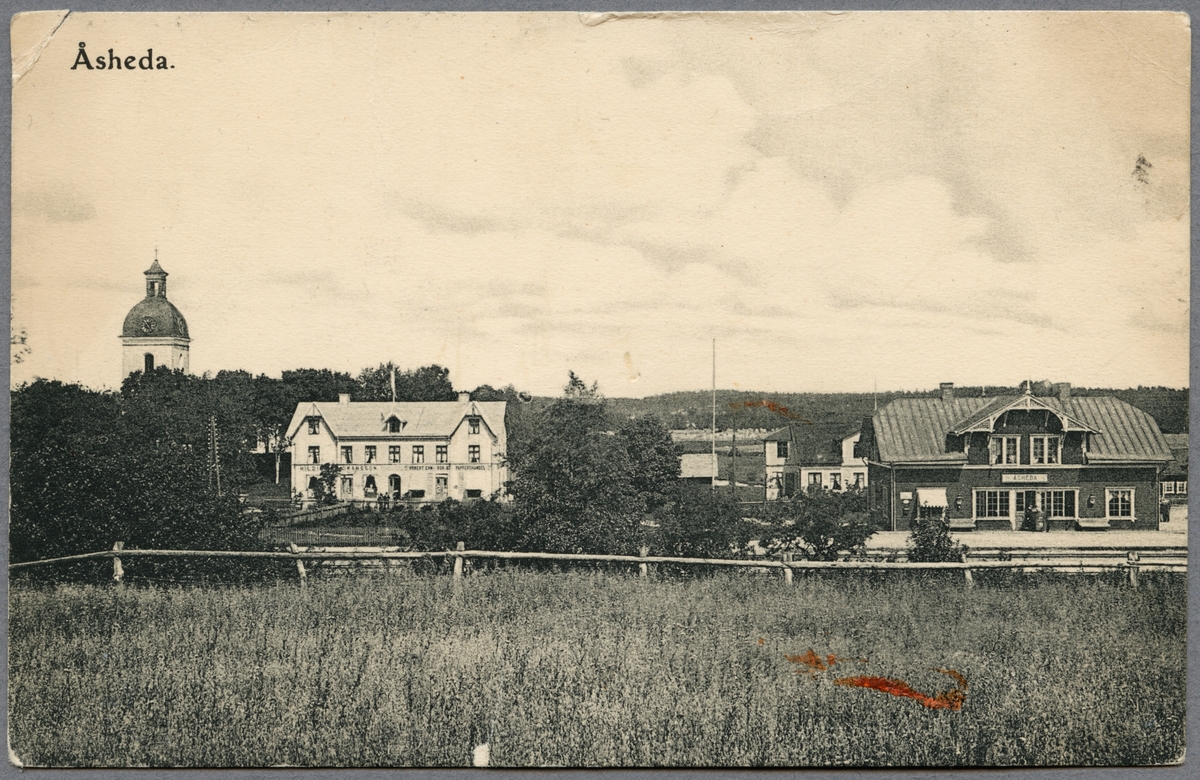 Bild på Åsheda, sedermera Åseda, station med kyrkan uppe till vänster.