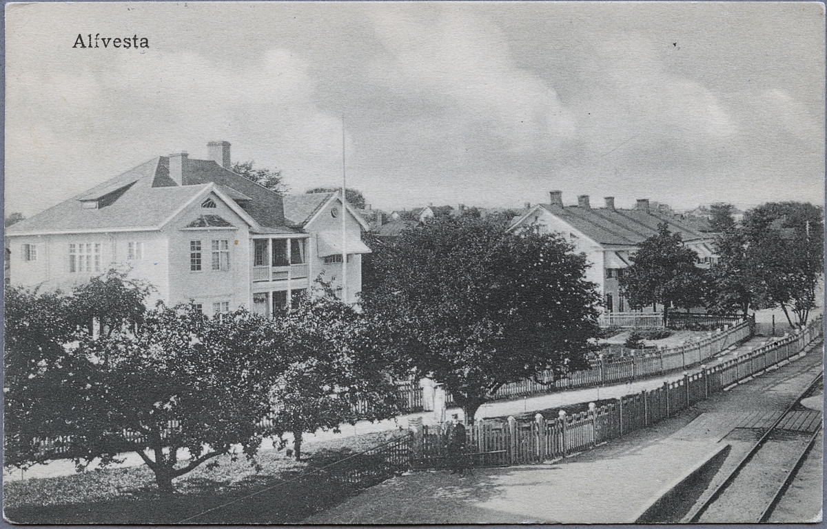 På bilden syns stationsinspektorns, stinsens bostadshus omgiven av lummiga träd.