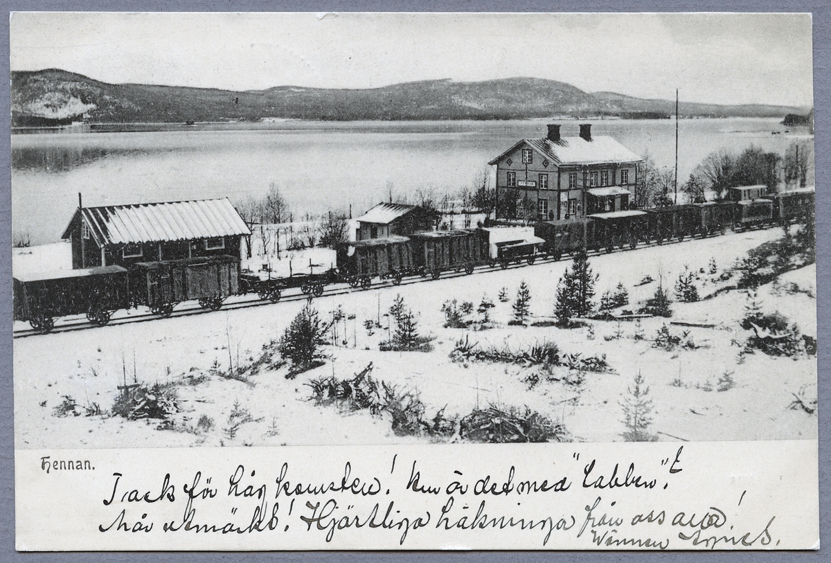 Vy över Hennan stationsområde med passerande tågsätt. I bakgrunden syns sjön med samma namn.