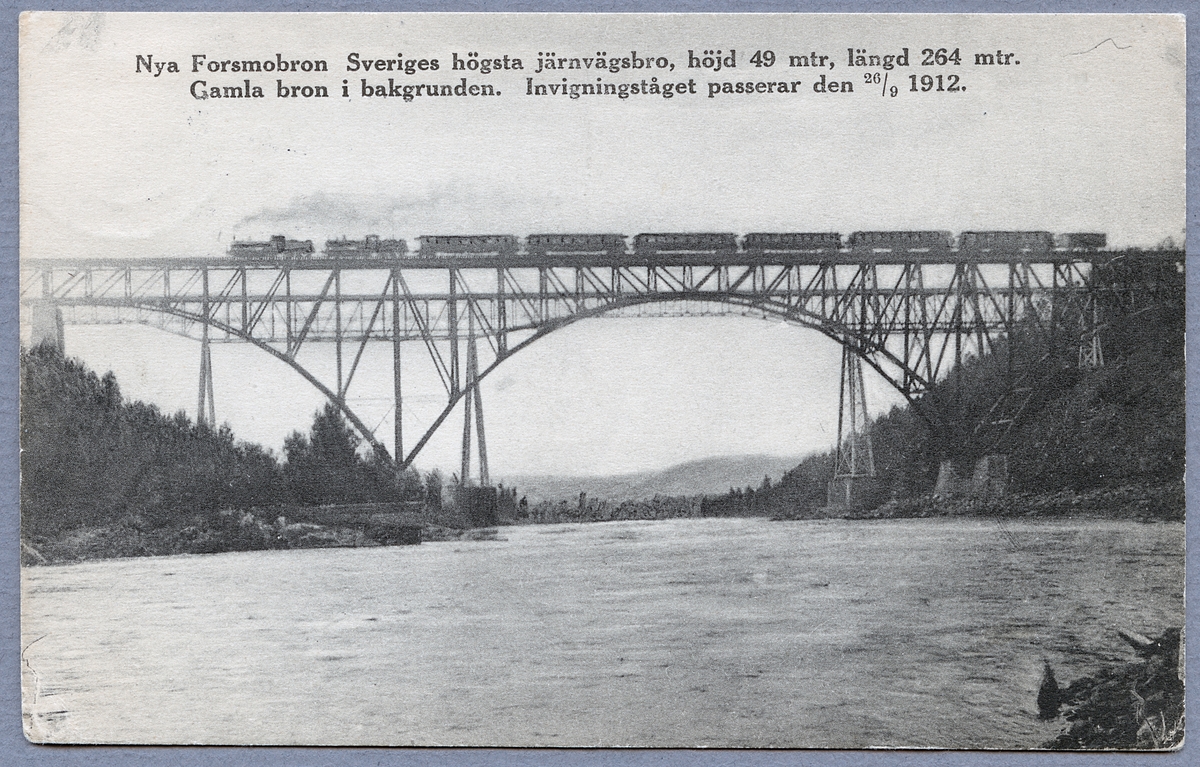 Nya Forsmobron med invigningståget. Gamla bron i bakgrunden.