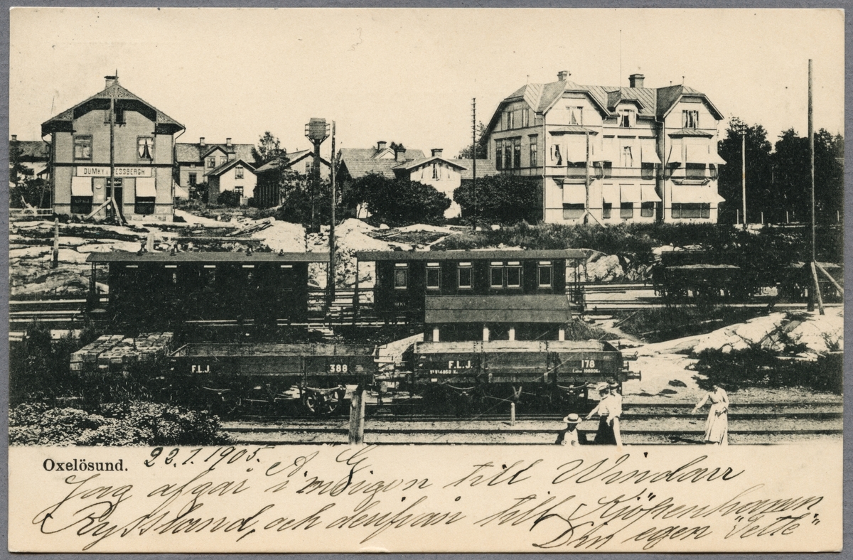 Stationsområdet i Oxelösund. Godsvagnar från Frövi - Ludvika Järnväg, FLJ.