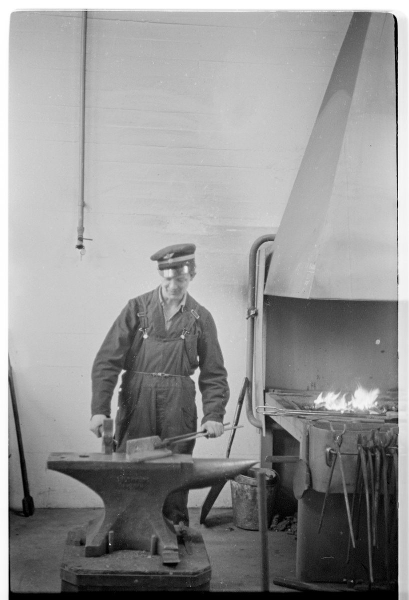 Ystads nya lokstation, uppförd av Statens Järnvägar, SJ 1946-1948. Arbete i smedjan.