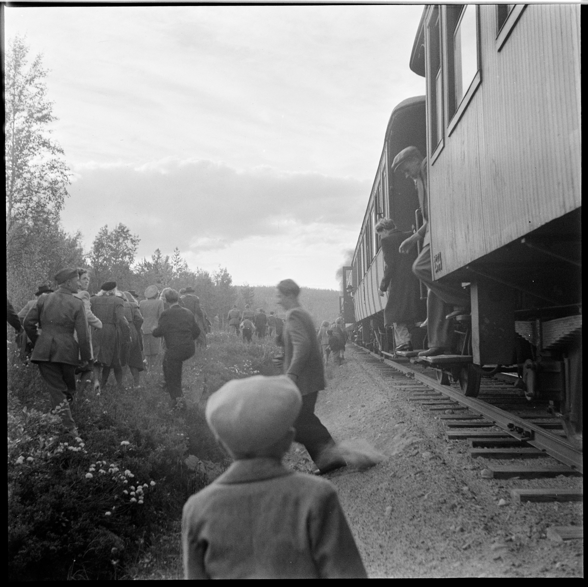Passagerare på väg upp till Luppioberget från järnvägen på linjen mellan Övre Niemis och Alkullen.