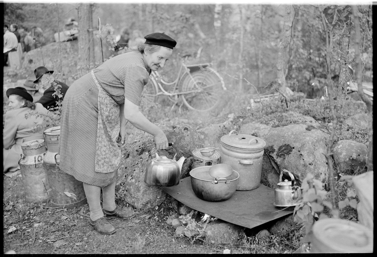En kvinna kokar kaffe med mera på en platta som är lagd över elden.
