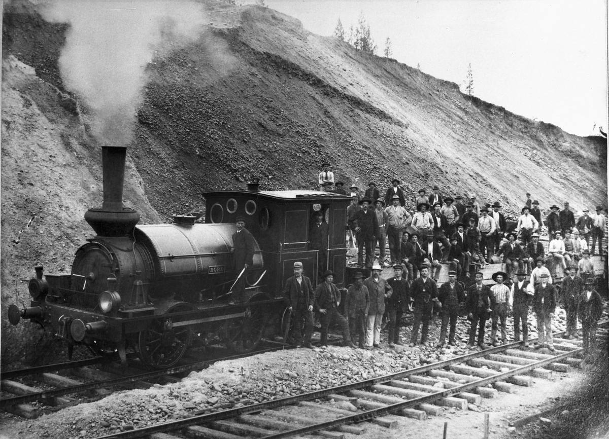 Statens Järnvägsbyggnader, SJB lok 3 "Bore". Byggnadsloket fick från 1898 littera SJ Qä 507. Rallarlaget och övrig personal står uppställda för fotografering vid arbetståget