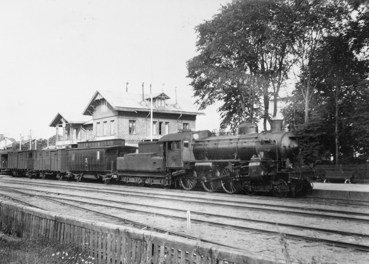 Statens Järnvägar, SJ B 1026 vid Vingåkers station. Efter loket en postvagn littra SJ D3 och därefter två resgodsvagnar littra SJ F1 den första av 1915 års modell och den andra 1902 års modell. TT.