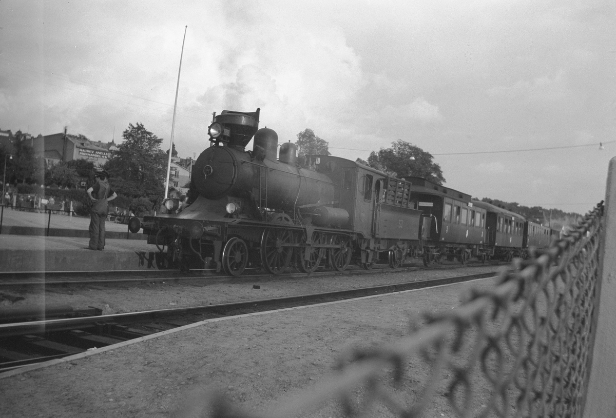 Statens Järnvägar SJ L6 1580 ( före detta VBHJ 20 ) med persontåg i Varberg.