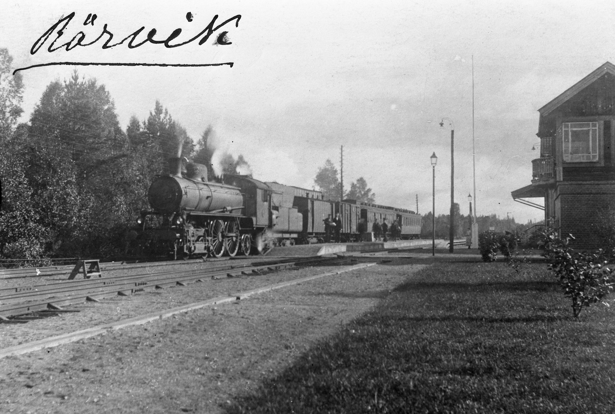 Statens Järnvägar SJ A-lok med tåg mot Nässjö. Persontåg 414 med vagnar D1, F1, C01, BC01 modell 1897.