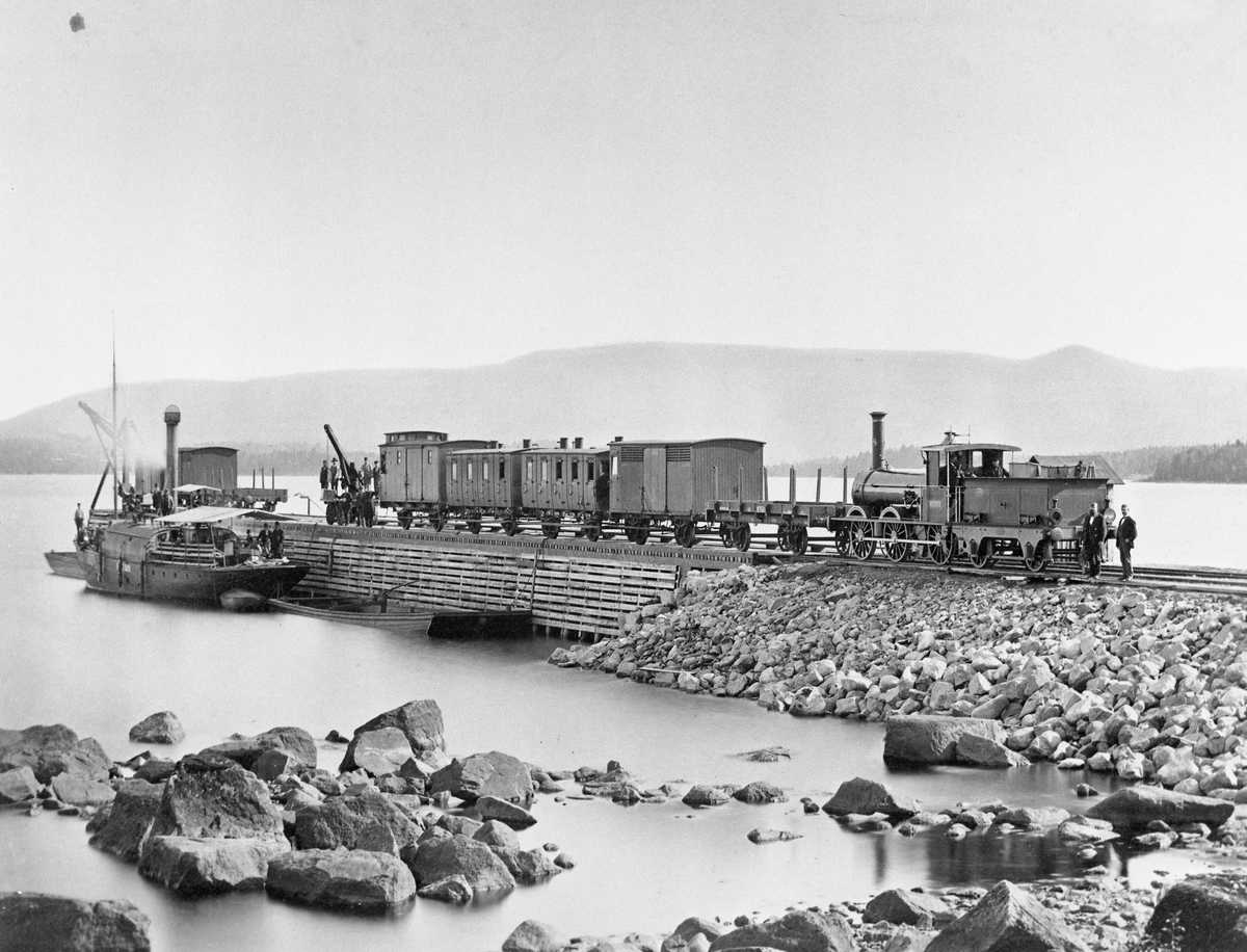 Statens Järnvägar SJ F 68 " Finnveden ".Station och lastplatsen Kilafors nedre omkring år 1880. Omstignings- och omlastningsplats mellan fartyg och tåg. Ångbåten är S/S Bergviken vilken strax kommer att avgå mot Bergvik där både gods och passagerare kommer att gå över till tåg för vidare befordran till Söderhamn. Tåget kommer också strax att avgå upp till Kilafors för att sedan fortsätta till Bollnäs. Foto: Sveriges Järnvägsmuseum.