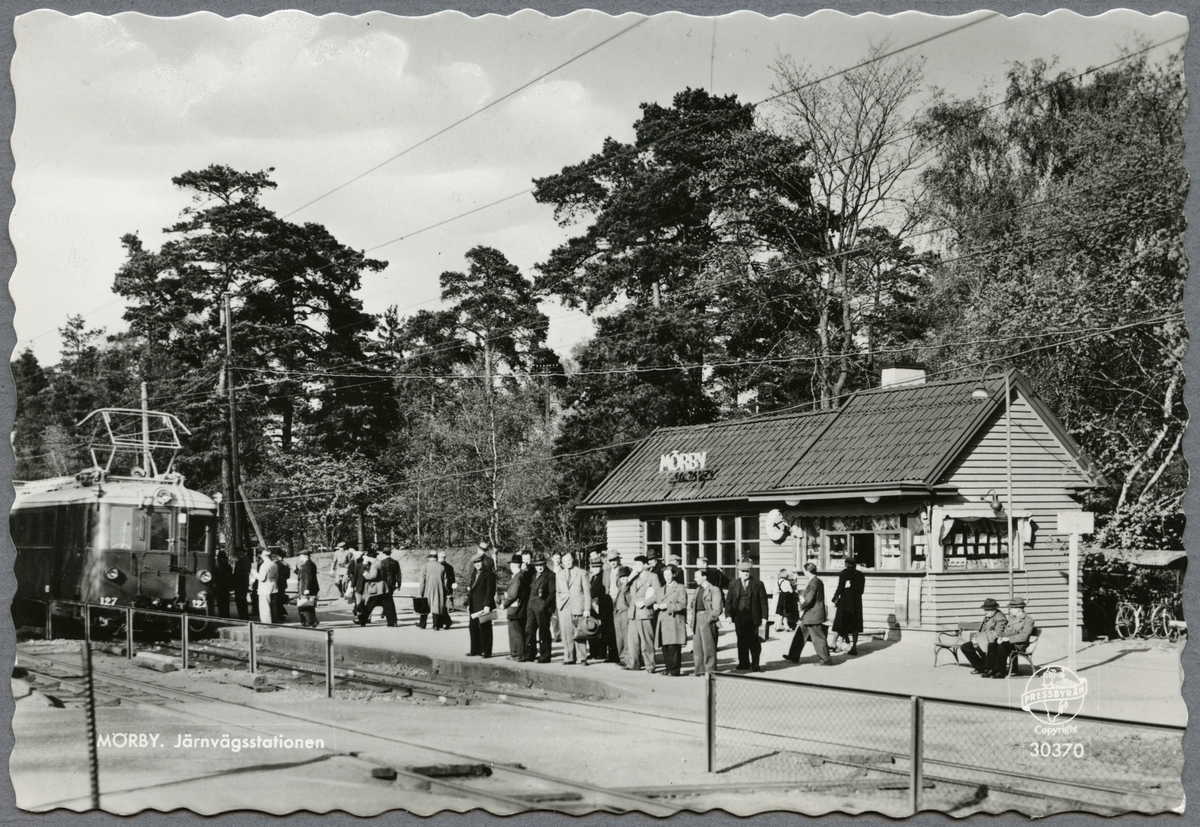 Mörby järnvägsstation. Stockholm - Roslagens Järnväg, SRJ motorvagn 127.