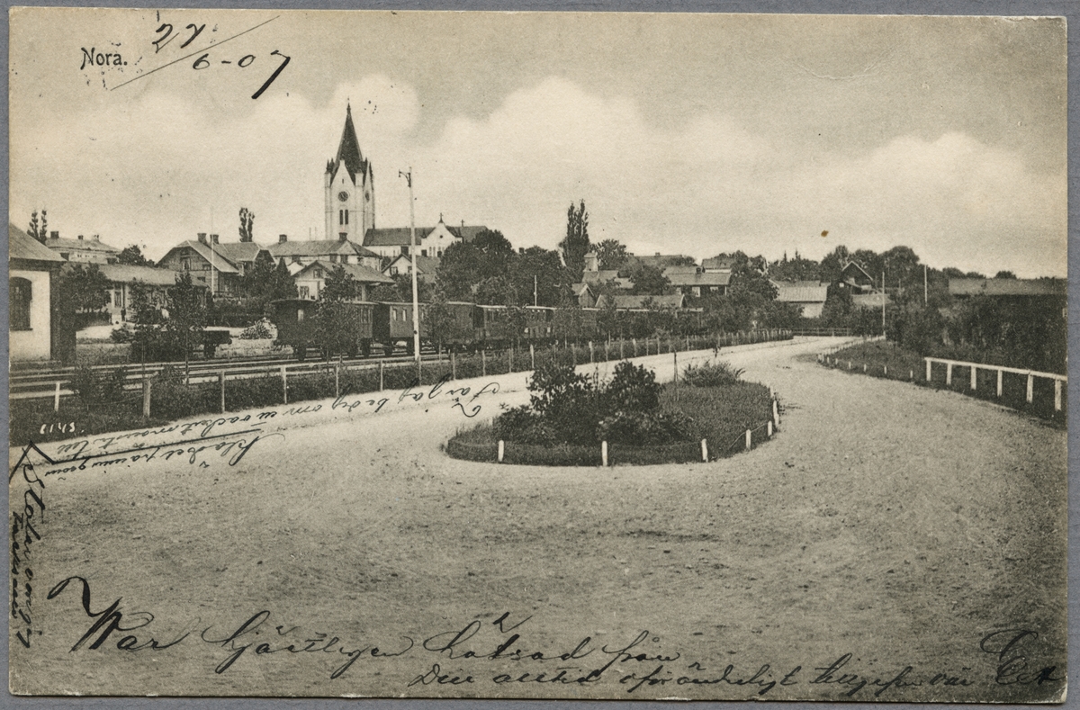 Vändplanen framför järnvägsstationen i Nora med samhället i bakgrunden.