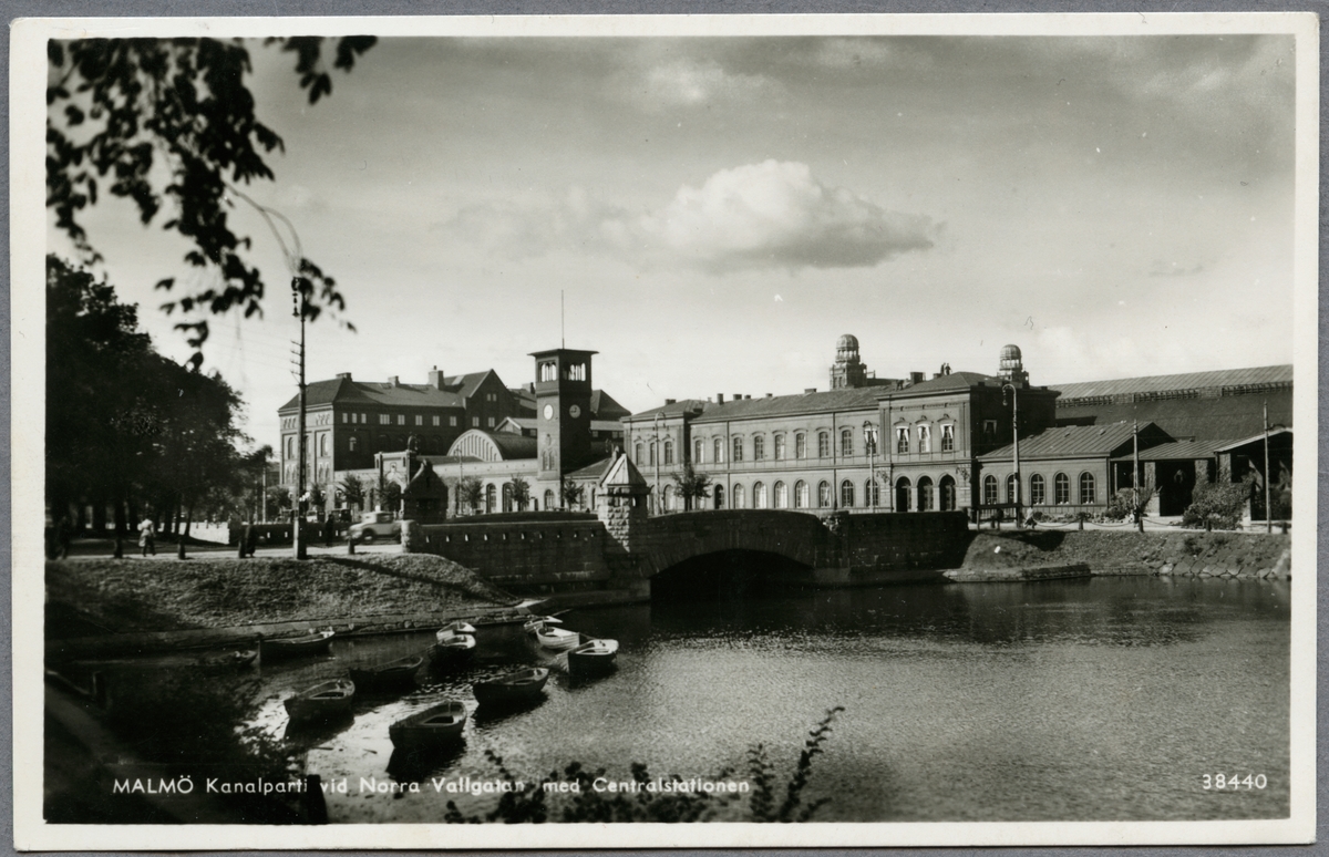 Kanalparti vid Norra Vallgatan, Malmö centralstation i bakgrunden.