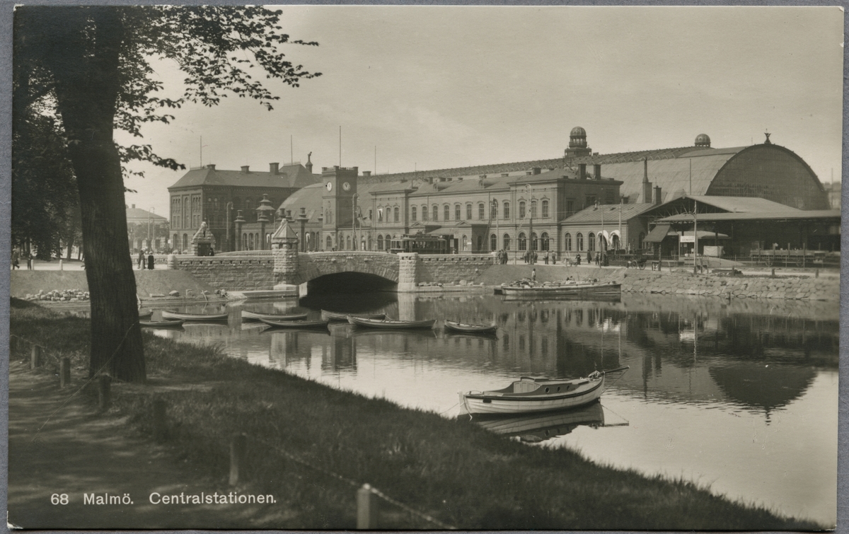Kanalparti vid Norra Vallgatan, Malmö centralstation i bakgrunden.
