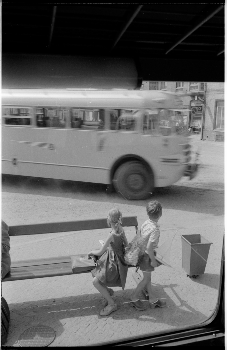 Väntande bussresenärer vid hållplats.