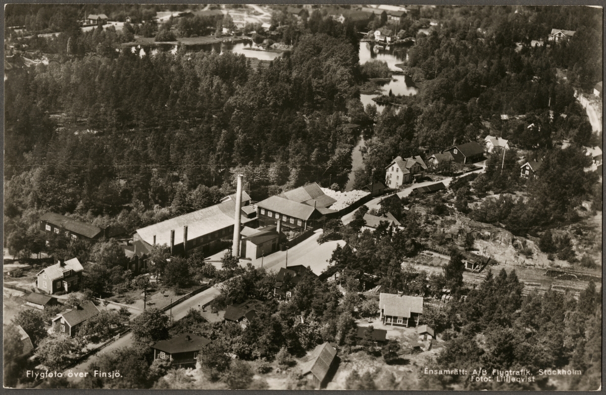 Flygfoto över Finsjö med Pappersbruket och Biskopshuset.