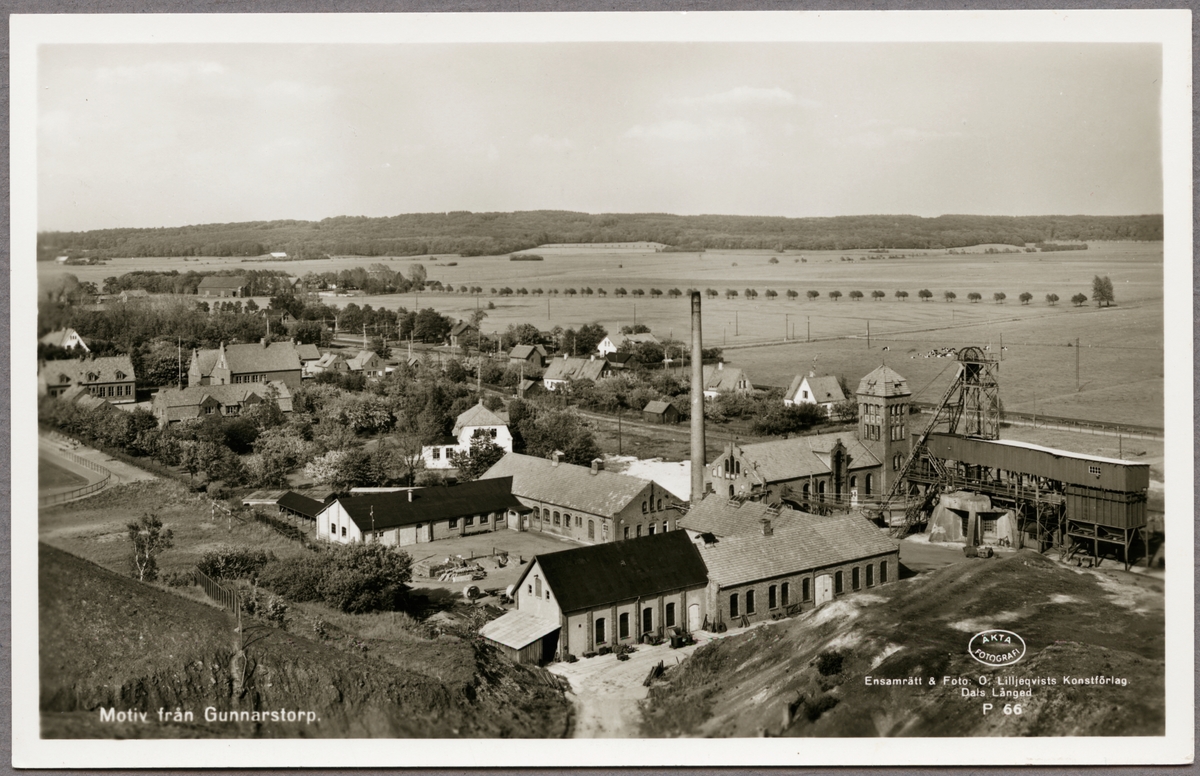Vy över gruvsamhället Gunnarstorp, med järnvägen i bakgrunden.