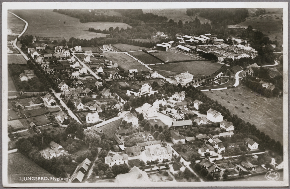 Flygfoto över Ljungsbro. I övre högra hörnet syns Cloetta-fabrikerna.